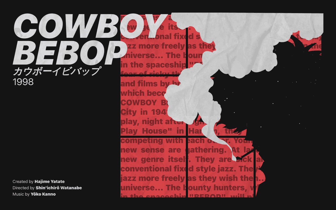 Trying to avoid unnecessary complexity, I approached this project from a minimalist perspective, I created a plain HTML file with tailwindcss and made a responsive design with two major blocks, one for the text content and the other for the silhouette; In the second one, I took inspiration from the show's opening where we can find bits of a paragraph overlayed on the solid color to tell a history ending with the ambitious phrase that gives title to the website: "The work, which becomes a new genre itself, will be called... COWBOY BEBOP".